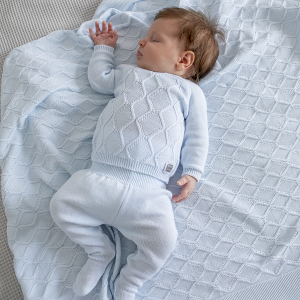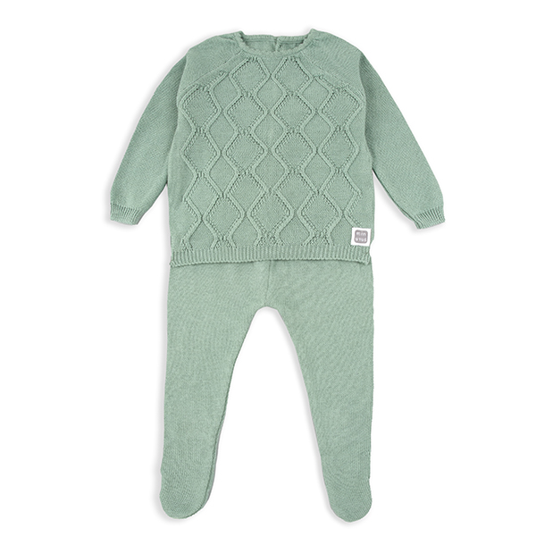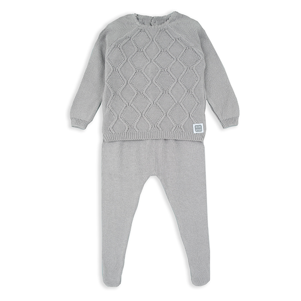 Questo completo è realizzato in un morbido tessuto di maglia di colore , perfetto per mantenere il tuo bambino comodo e al caldo. La parte superiore presenta un elegante motivo a rombi in rilievo che aggiunge un tocco classico, mentre i pantaloni includono piedini coperti per un calore extra. Il completo è rifinito con polsini e orli a coste per garantire una vestibilità confortevole e sicura. Ideale per occasioni speciali o per l’uso quotidiano, è un’opzione incantevole per il guardaroba del tuo bambino.